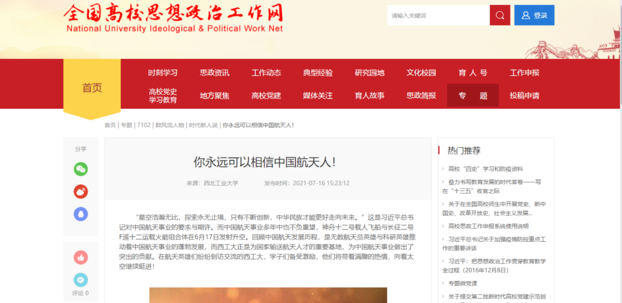 “星空浩瀚无比,探索永无止境,只有不断创新,中华民族才能更好走向未来。”这是习近平总书记对中国航天事业的要求与期许。回顾中国航天发展历程,是无数航天员英雄与科研英雄推动着中国航天事业的蓬勃发展,而西工大正是为国家输送航天人才的重要基地,为中国航天事业做出了突出的贡献。在航天英雄们纷纷到访交流的西工大,学子们备受激励,他们将接过老一辈航天人的接力棒,用党的光荣传统和优良作风坚定信念,向着太空继续挺进!