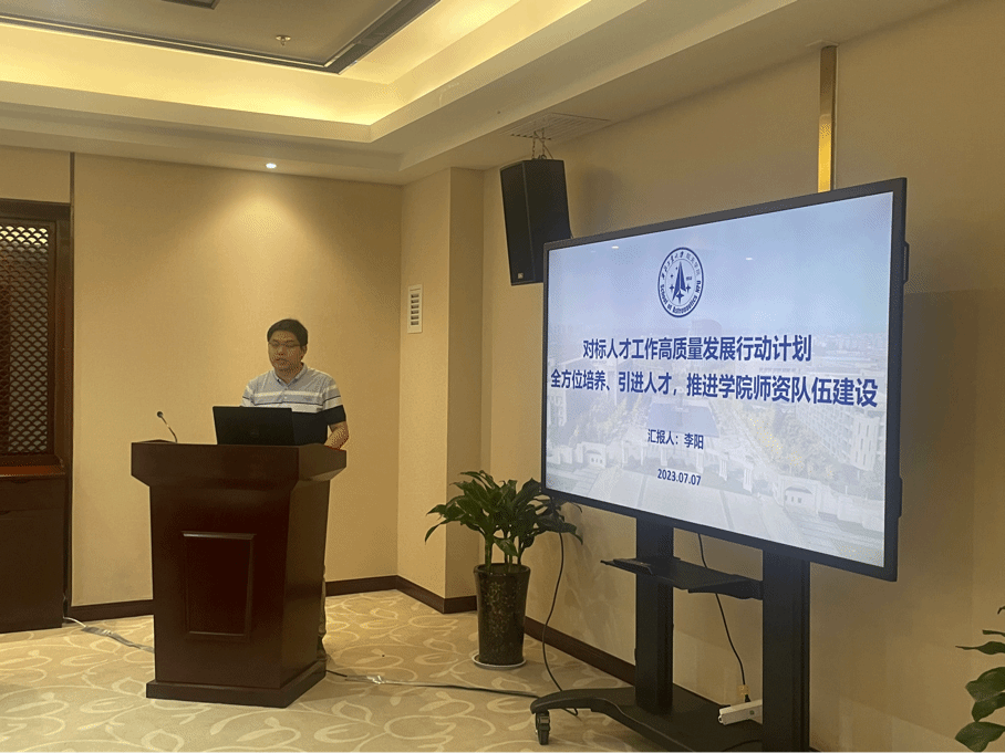 会上,院长助理李阳以“对标人才工作高质量发展行动计划,全方位培养、引进人才,推进学院师资队伍建设”为主题,全面总结“十三五”以来学院人才工作的经验和成效,并分析了目前存在的问题与不足。他从人才的“引”“育”“用”三方面,汇报了学院人事人才工作后续工作思路和未来建设目标。
