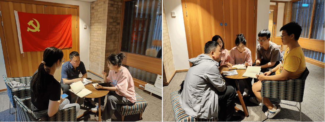 研学团队临时党支部委员会由李国骏担任书记、龚诗琪担任组织委员兼任纪检委员、程文绮担任宣传委员,共有10名共产党员,负责团队在英国研学期间的主题教育、理论学习等工作。党支部委员会定期召开会议,制定学习计划、分析团队状况、部署互助安排等工作,同时将12名共青团员和2名群众纳入集体学习当中,推进以党建带团建、以党组织带研学团队工作,实现党建业务融合发展。