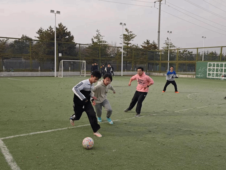 彩霞方好,活力无穷。在一片欢声笑语之中,三支队伍、十五名队员在绿茵场上尽情奔跑、相互追逐。“战场”形势“风云诡谲”,队员们制定“计策”,紧密配合,共同为我们呈现了一场体力与“谋略”相结合的精彩“战斗”。