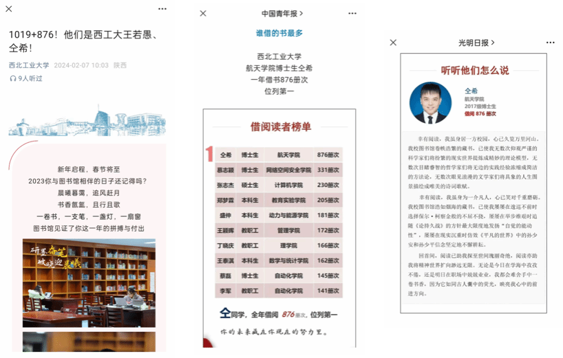 除此之外,仝希同学还是西工大图书馆2023年借阅图书最多的人,被best365官方网站登录入口、中国青年报、光明日报等多个官微所报导。他也向同学们分享了自己阅读文献的经验与感想,第一,集百家所长。第二,相同点相互对照。第三,不同点积极延伸。第四,课本中的示例勤于验算。第五,快速且有重点地阅读。