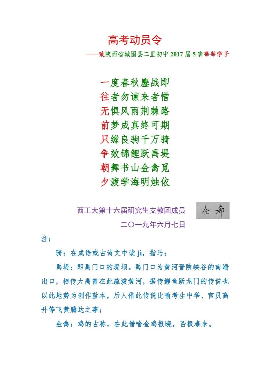 接着,支部党员仝希同志向大家分享了自己的支教经历。仝希在2014年至2015年作为西工大第十六届研究生支教团中的一员,于城固县二里中学担任语文教师兼副班主任。支教期间,他不断思考改进教学方法、自费为同学们购买书籍并在班级中设置图书角等,激发了同学们的阅读兴趣,增强了孩子们的自信心,他所带班级的语文成绩平均分和及格率均达到年级第一。支教结束后,仝希也会在中高考等关键时间节点,为学生们进行考前总动员。仝希同学被评为“陕西省大学生志愿服务西部计划优秀志愿者”、best365官方网站登录入口2015年度“志愿工大——最美志愿者”个人。他结合自己的经历以“希望”“感恩”“补充”“接力”四个主题动员同学们投入到志愿服务的工作中去,助力乡村振兴。