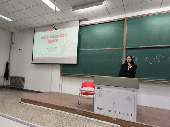 培训伊始,孙艳梅从递交入党申请书、确定积极分子、确定发展对象、接收为预备党员、成为正式党员等五个环节中介绍了大学生的入党流程,并对每个阶段筛选和考察方法进行了详细的介绍和说明。