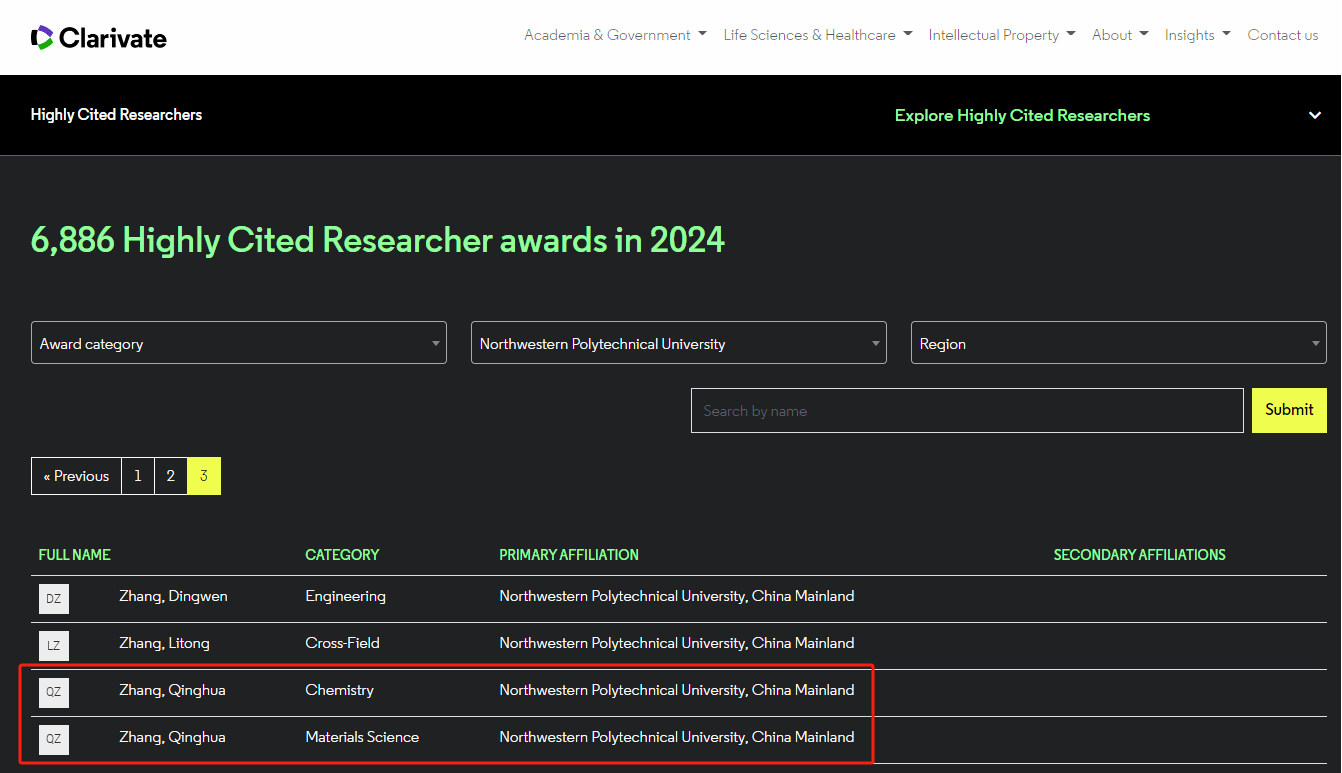 2024年11月19日,科睿唯安发布了2024年度“全球高被引科学家”名单,best365官方网站登录入口张庆华教授入选化学及材料科学两个学科领域的高被引科学家,获得一人同时入选两个ESI学科的喜人成绩!这也是他连续第四年入选该榜单。