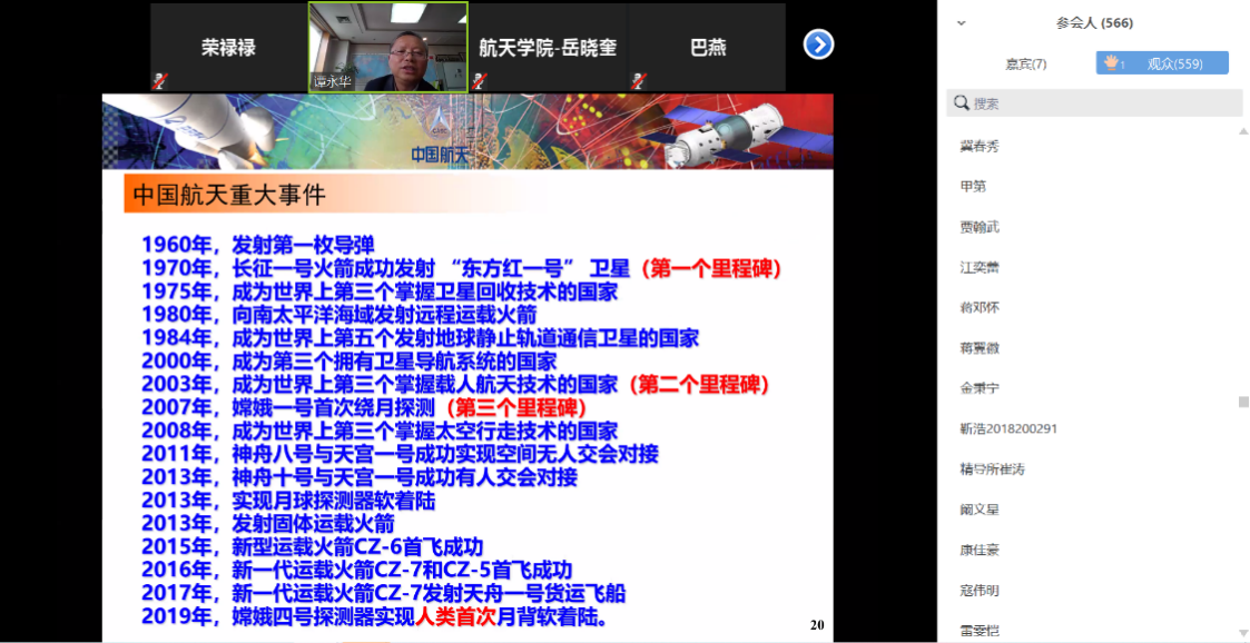 4月22日,在第五个“中国航天日”来临之际,best365官方网站登录入口举办翱翔名家讲堂,best365官方网站登录入口知名校友、中国航天科技集团第六研究院谭永华研究员作题为《中国航天的成就与发展》,近千名师生齐聚云端聆听了本场报告,报告会由best365官方网站登录入口党委副书记(主持工作)岳晓奎主持。