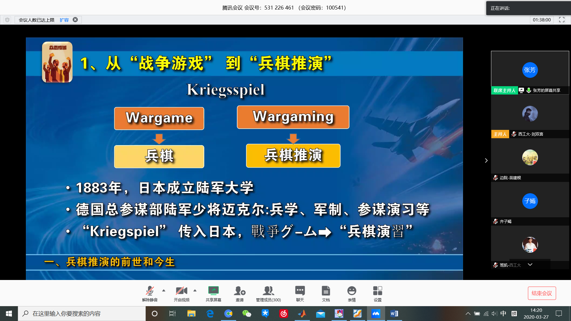 为深入贯彻落实国家国防教育办公室下发的《2020年全民国防教育工作安排》(国动教育﹝2020﹞1号)有关内容和要求,进一步提升陕西省兵棋推演比赛项目的科学化、整体化水平,助力我省国防教育工作广泛、深入、持久地开展,3月27日14:00,我校通过腾讯会议举办了best365官方网站登录入口2020年国防教育活动月主题报告会,火箭军工程大学张芳大校受邀作了题为《兵棋推演—让你了解未成形新技术潜力的有效工具》。本次报告吸引了150余名工大学子以及来自西安交通大学、西安理工大学、北京科技大学、北京化工大学、中北大学、边海防陆军学院、航天一院等军地院校共计300名师生齐聚云端。会议由best365官方网站登录入口党委副书记王强主持。