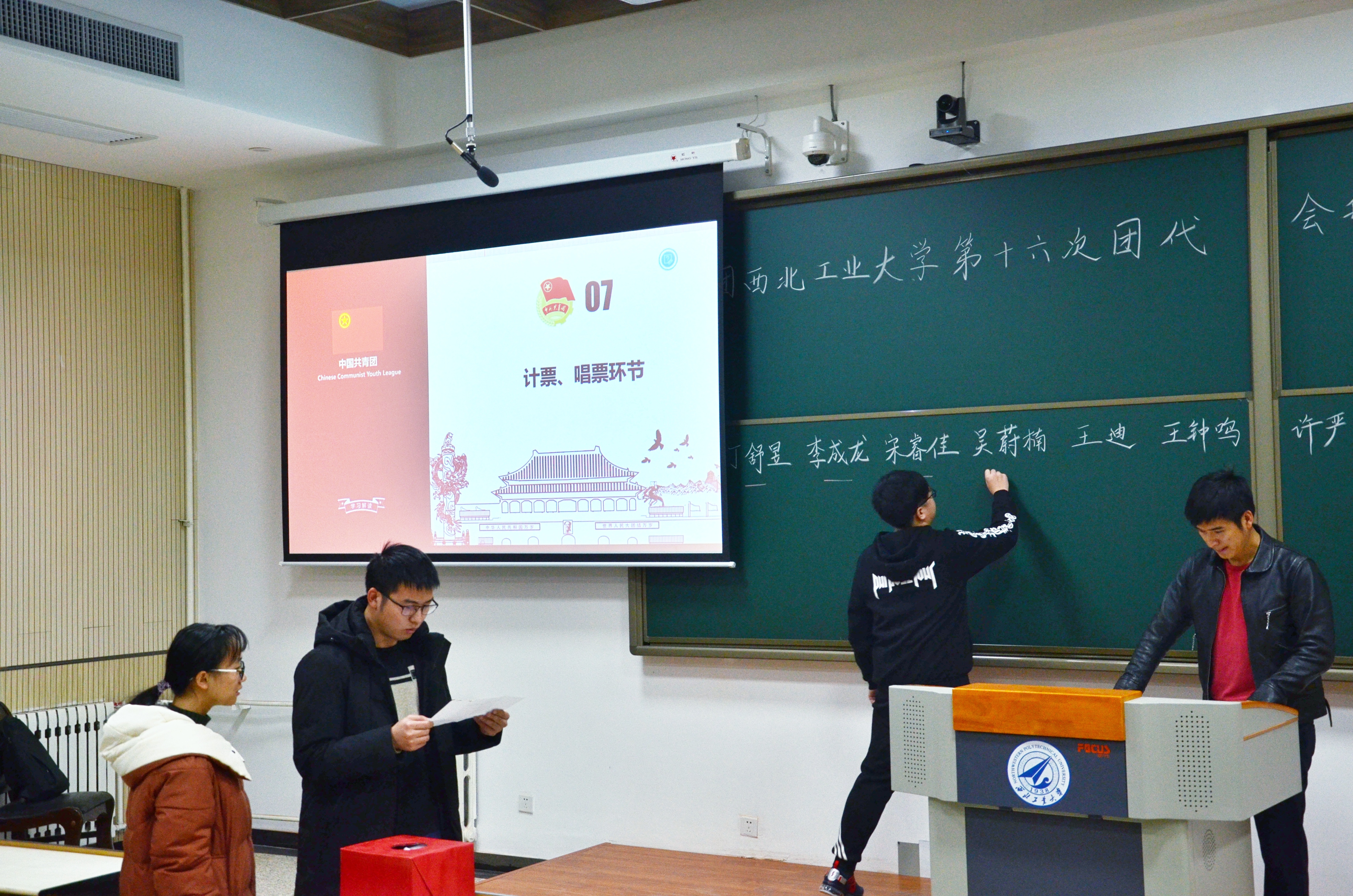 大会伊始,吴蔚楠老师向大家介绍了团代会的基本情况,宣读并通过了选举规则及监票人、计票人和唱票人名单,并简单介绍了各位代表候选人简历。正式选举前,通过广泛征求教师与学生意见,已初步推举出出席校第十六次团代会代表人选。