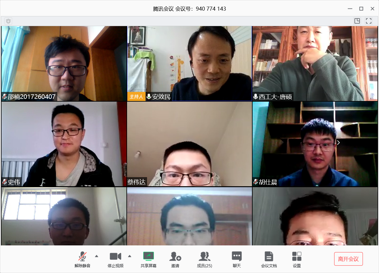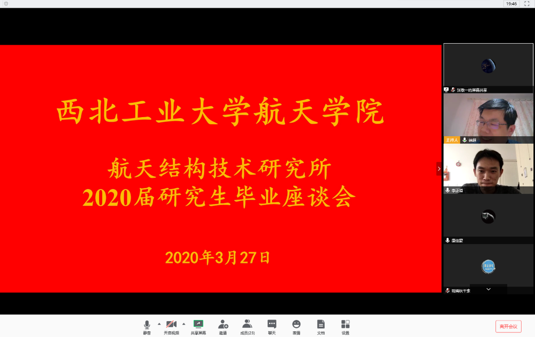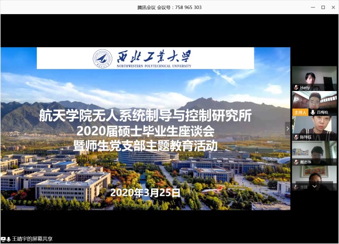 2020年3月25日至4月2日,best365官方网站登录入口按照学校要求,以研究所为单位组织召开了“感恩工大情 激扬爱国志”2020届研究生毕业座谈会,学院领导、研究生导师和2020届毕业研究生共同参加。