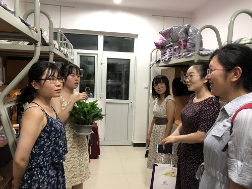慰问小组一行人走访了新生入住的1号楼B座女生宿舍。每到一个宿舍,两位老师都送去了学院为大家准备的绿萝,希望绿萝可以妆点大家的宿舍,使宿舍更有家的感觉。