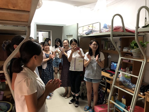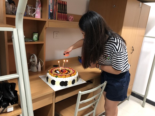 值得一提的是,为了让大家更体验到学院的人文关怀,也希望通过一次小范围的生日会更加拉近同学们之间的关系,慰问小组准备了生日蛋糕为8月30日过生日的张婧怡同学补一次生日。两位老师召集了2018级所有新入学的女生一起,同唱生日快乐歌,为张婧怡同学庆祝生日,也为所有新同学送祝福。张婧怡同学激动地表示道,真的太意外了,自己本科不是西工大的,来这里有点陌生,但是没想到学院会这么贴心,非常感动,以后希望和大家好好相处,共同度过两年多的同窗时光。