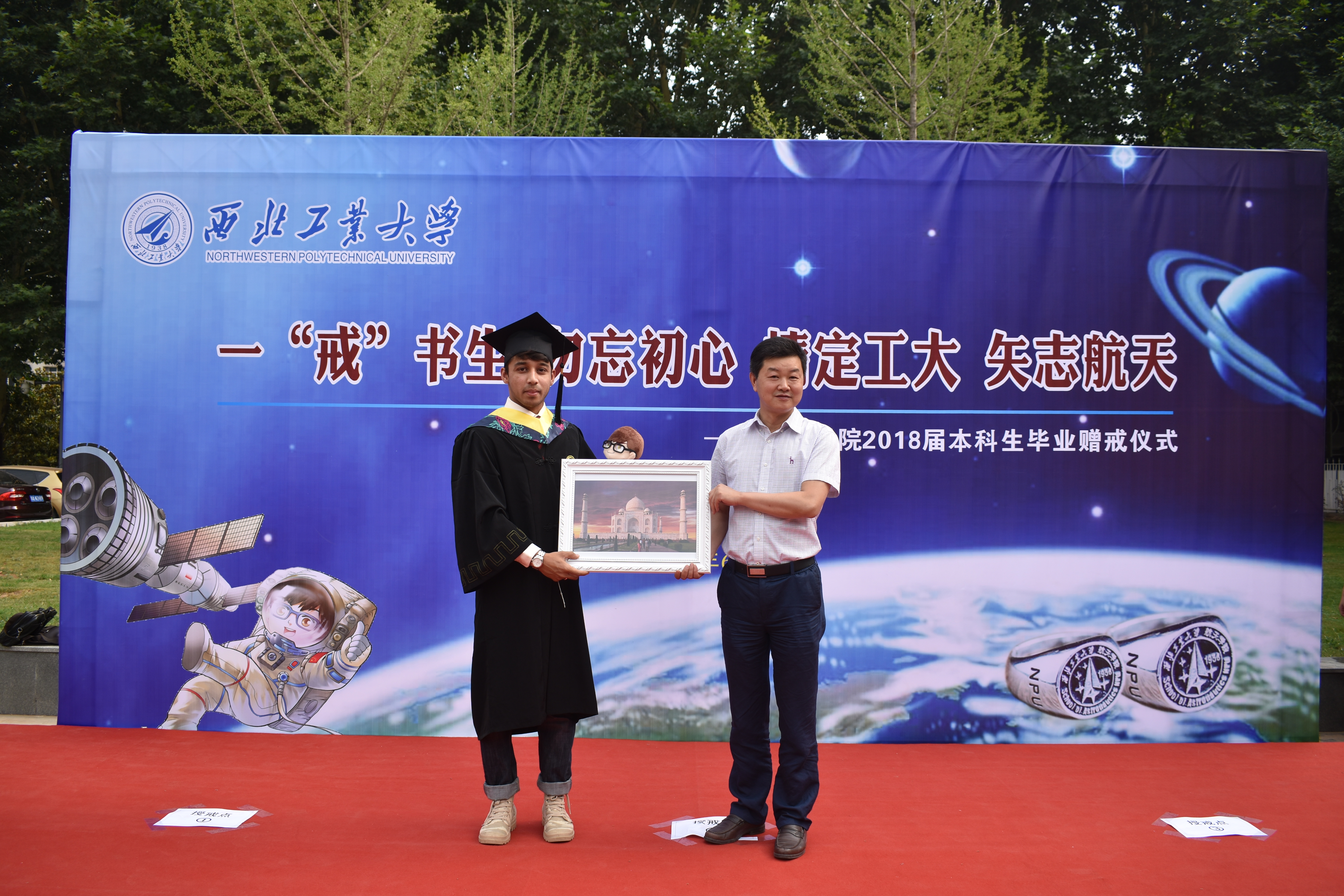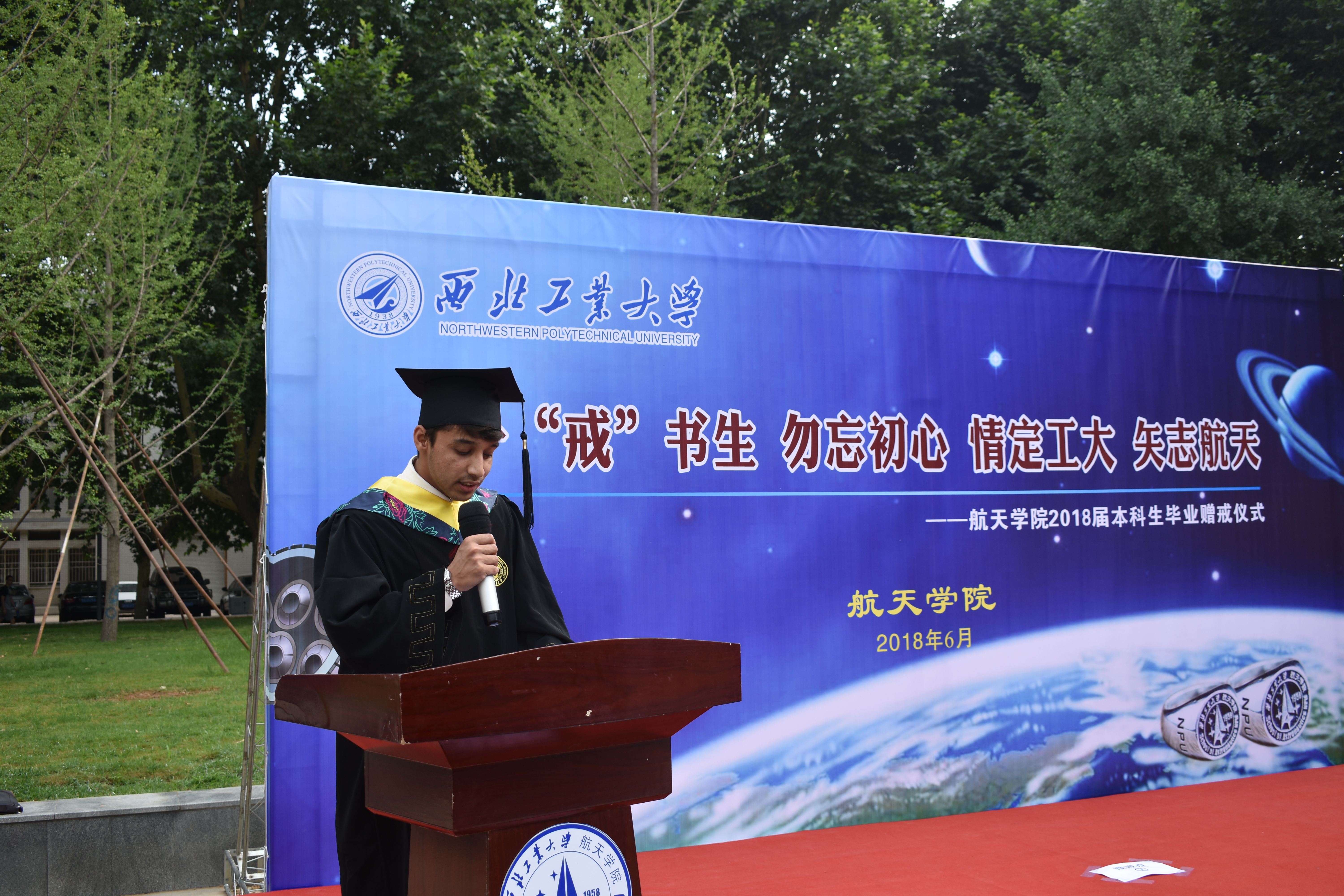 随后,best365官方网站登录入口院长唐硕宣读了《关于表彰best365官方网站登录入口2018届优秀毕业本科生的决定》,并对索文博等14名获得优秀毕业本科生称号的同学表示祝贺。接着,best365官方网站登录入口史上第一位本科毕业留学生FAHART发言表示感谢best365官方网站登录入口辛勤培养并向best365官方网站登录入口赠送泰姬陵模型,best365官方网站登录入口院长唐硕为其授予航天戒。一枚航天戒,联系的是所有航天学子的心,无论肤色,无论国籍。然后,2018届本科毕业生代表何金阳同学发言,她带大家回顾了求学路上的点点滴滴,并深有感触的说,“毕业并不代表结束,而是宣布另一个开始。”