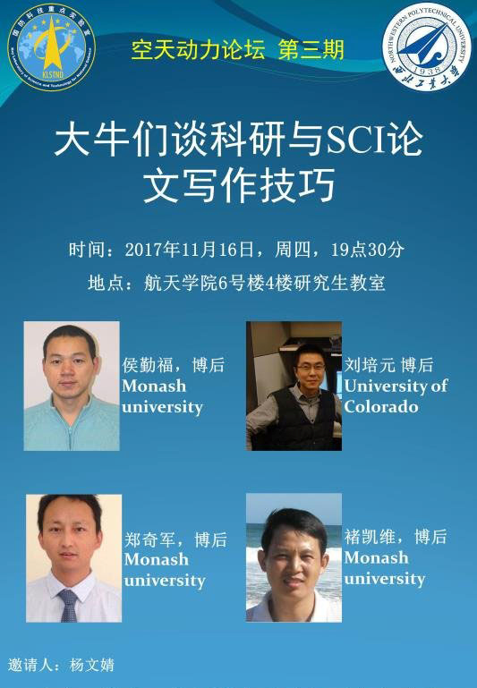 为响应学院积极开展学风建设的号召,2017年11月16日,空天动力研究所组合动力课题组在best365官方网站登录入口6号楼4楼研究生教室举办了“飞天讲堂”活动。此次活动的主题是“科研经历分享与SCI论文写作技巧”,旨在提升课题组研究生的科研能力和论文写作能力。