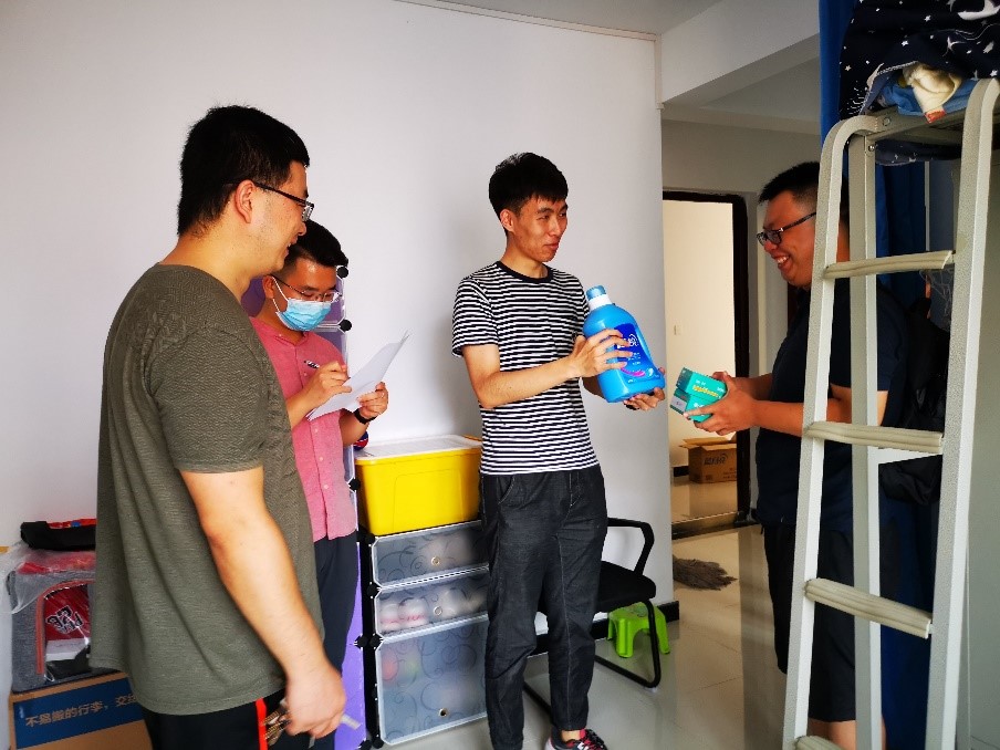 为全力做好宿舍疫情防控工作,帮助同学们适应新环境,学院为学生宿舍送去了洗衣液等生活物品,提醒同学们做好必要的防范措施,确保自己及身边人的身体健康。同时与同学们沟通生活及宿舍细节,提醒各位同学在生活上如有不适应的地方,要及时与辅导员老师沟通解决。